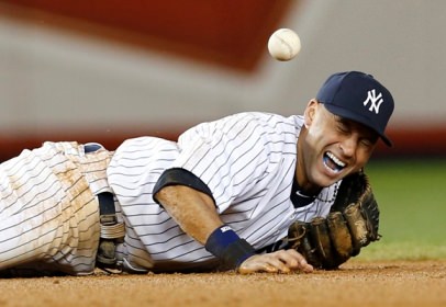 New York Yankees shortstop Derek Jeter screams as he injures himself fielding a ball hit by Detroit Tigers' Jhonny Peralta during the 12th inning of Game 1 of their MLB ALCS playoff baseball series in New York, October 13, 2012. REUTERS/Mike Segar (UNITED STATES - Tags: SPORT BASEBALL)